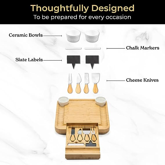 The set includes three specially crafted stainless steel knives, each designed to handle different types of cheeses with precision and ease. From soft and creamy brie to hard and aged cheddar, these knives enable you to slice, spread, and serve your favorite cheeses effortlessly. The inclusion of the knife set ensures that you have all the necessary tools at your disposal, making your charcuterie and cheese board experience seamless and enjoyable.